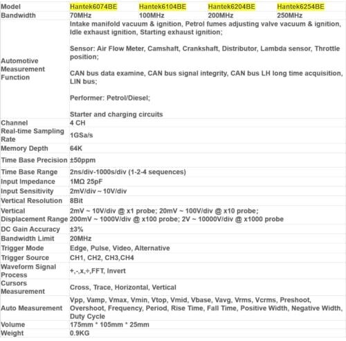 Hantek6074BE series portable USB/PC oscilloscope kit for automotive and electronics testing. Plug-and-play on laptops or tablets, four channels, real-time sampling, FFT, averaging, and simple PASS/FAIL validation. Export data to Excel, BMP, JPG for reports.
