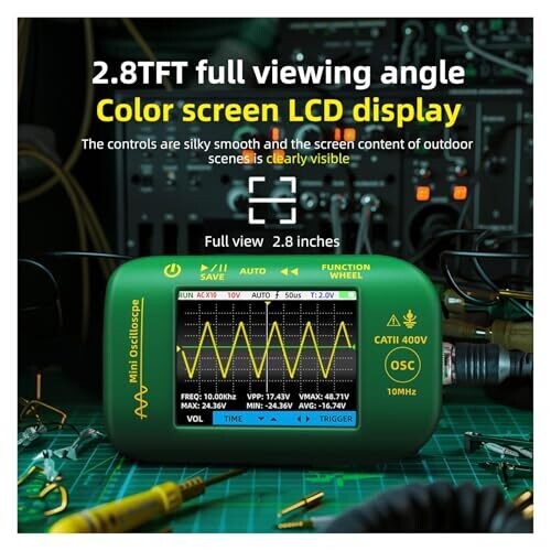 A compact handheld oscilloscope with a 2.8-inch color display and built-in rechargeable battery for field use. It supports data storage, USB export, carrying case, probes, and can capture both analog and digital signals for on-the-go testing.