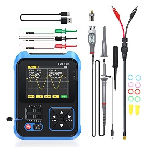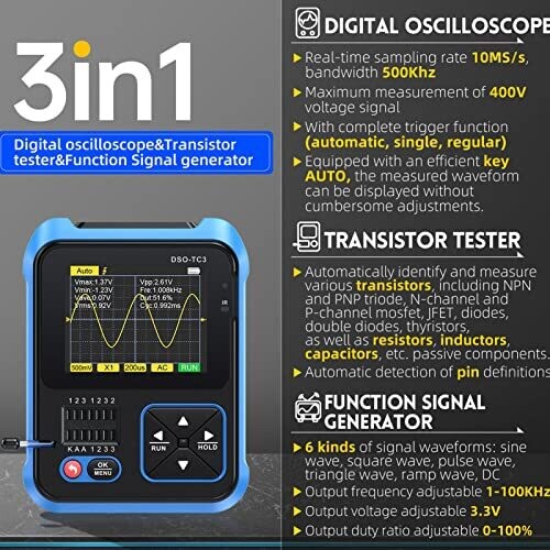 - Experience a compact, versatile instrument that combines a digital oscilloscope, electronic component tester, and PWM signal generator in one handheld device.