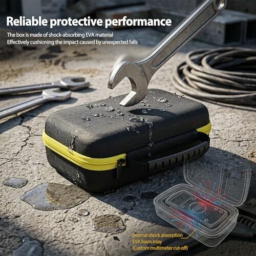 Shock-absorbent EVA protection with adjustable dividers and mesh pockets keeps F115C, F116C, F117C meters and accessories organized. Slim, lightweight case with a sturdy handle, yellow and black design, water resistant storage box for job sites. Case only.