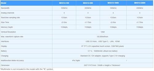 Micsig MHO14-100 Series is a handheld 4-channel oscilloscope with a 12-bit ADC, up to 1GSa/s sample rate, 100 MHz bandwidth, and 110 Mpoints memory. It features an 8-inch touch screen for portable, easy screen navigation and analysis.
